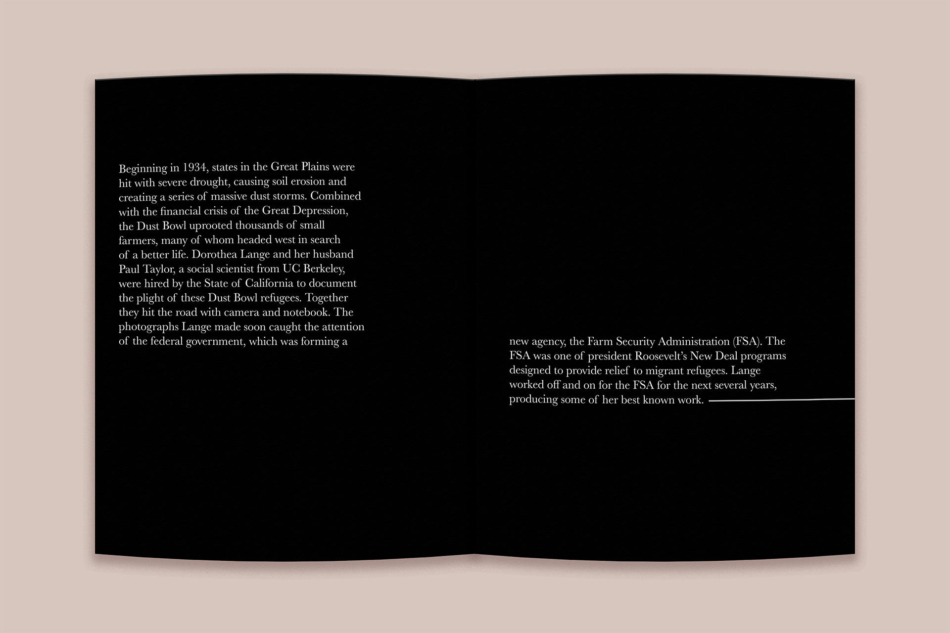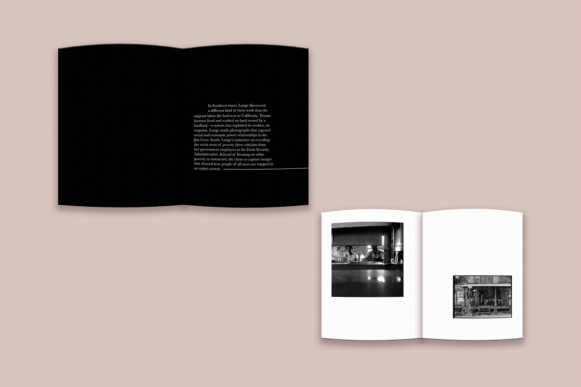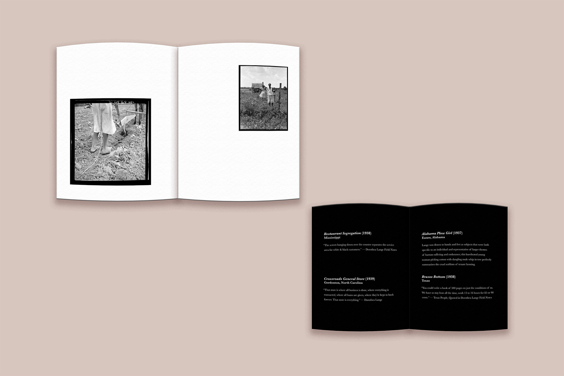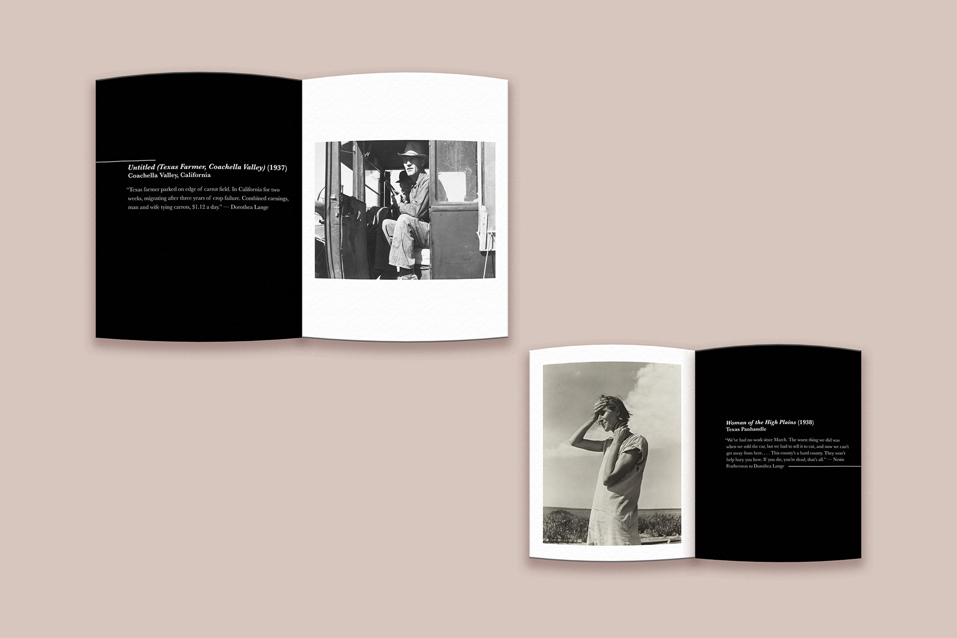 The layout takes inspiration from museum exhibits, using open space, consistent type hierarchy, and thoughtful pacing to create a calm and reflective experience. My goal was to make the book feel like a small curated exhibition that captures the emotion and weight of Lange’s Great Depression photography.