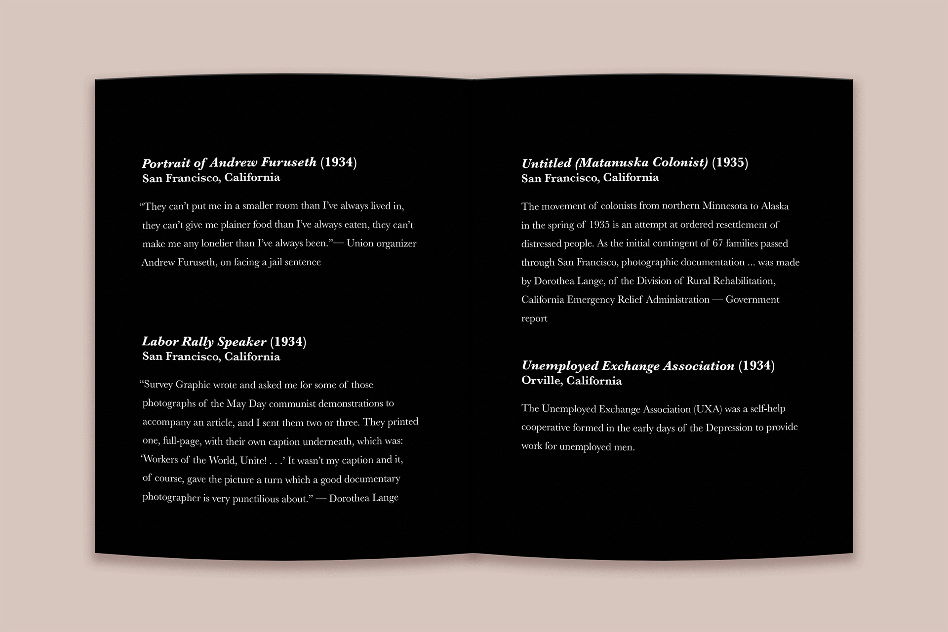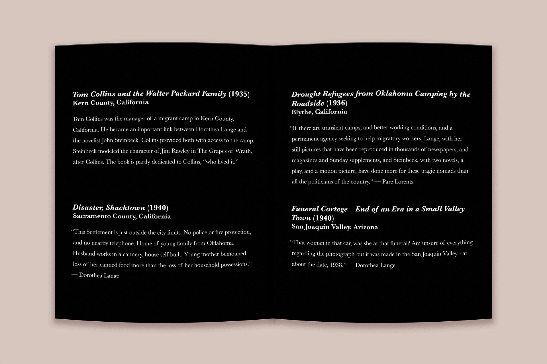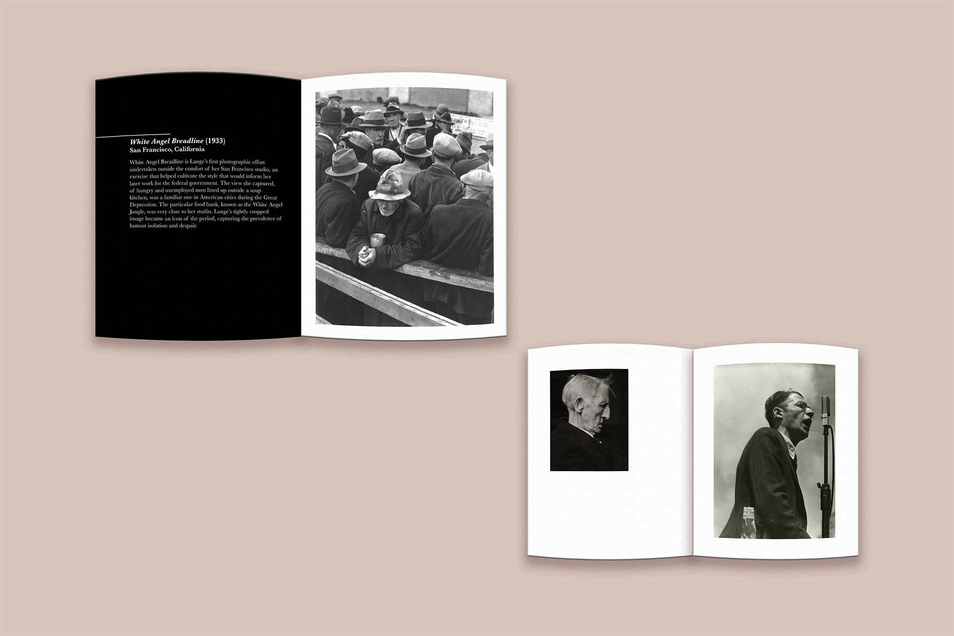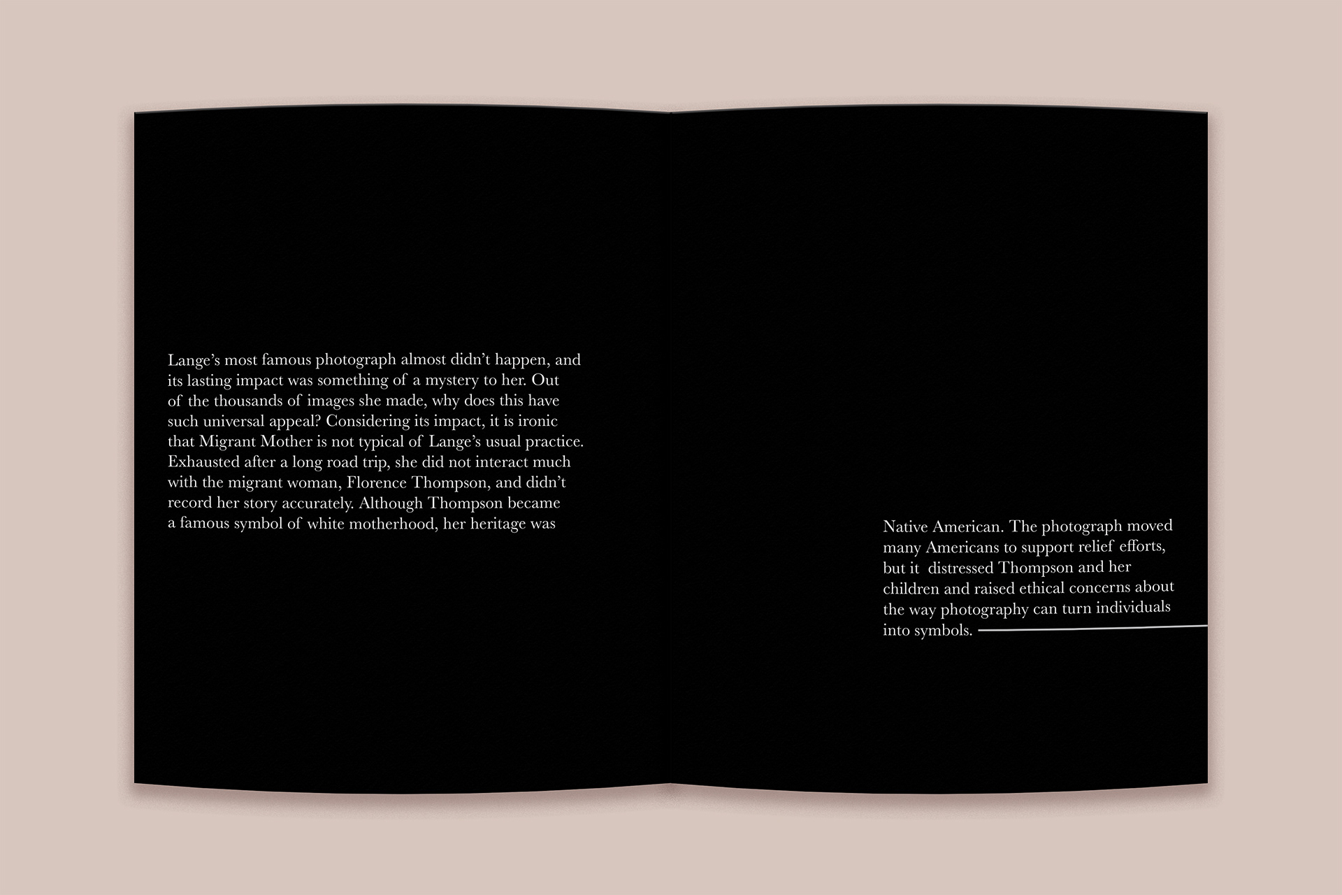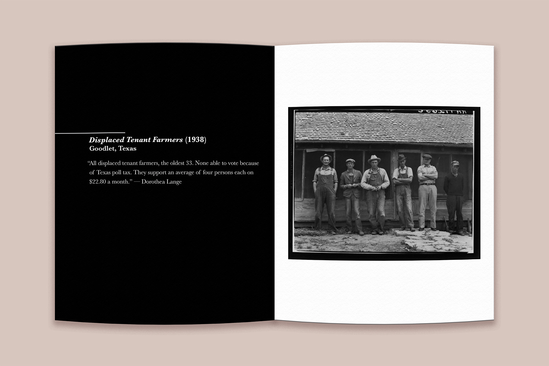 The layout takes inspiration from museum exhibits, using open space, consistent type hierarchy, and thoughtful pacing to create a calm and reflective experience. My goal was to make the book feel like a small curated exhibition that captures the emotion and weight of Lange’s Great Depression photography.