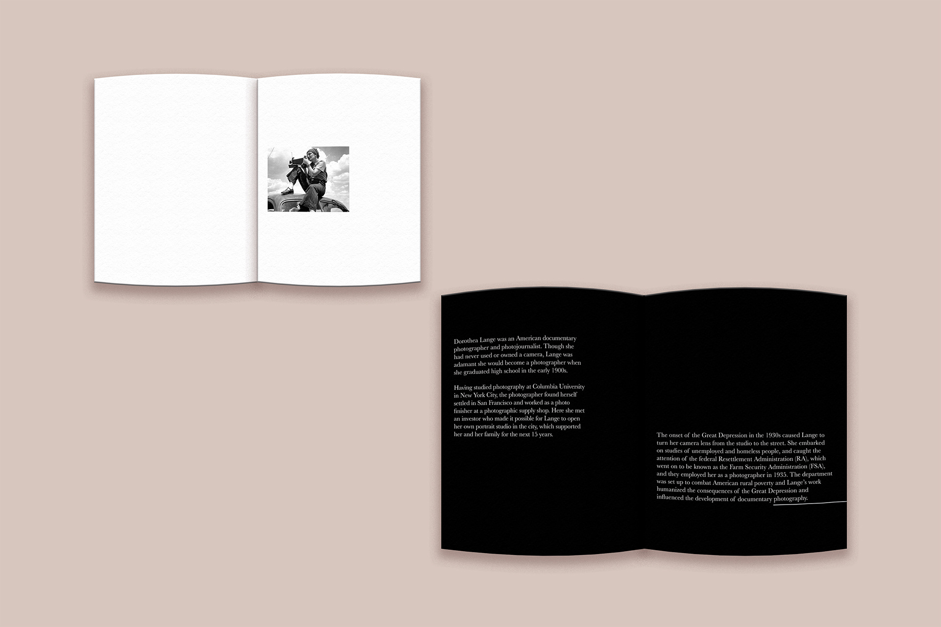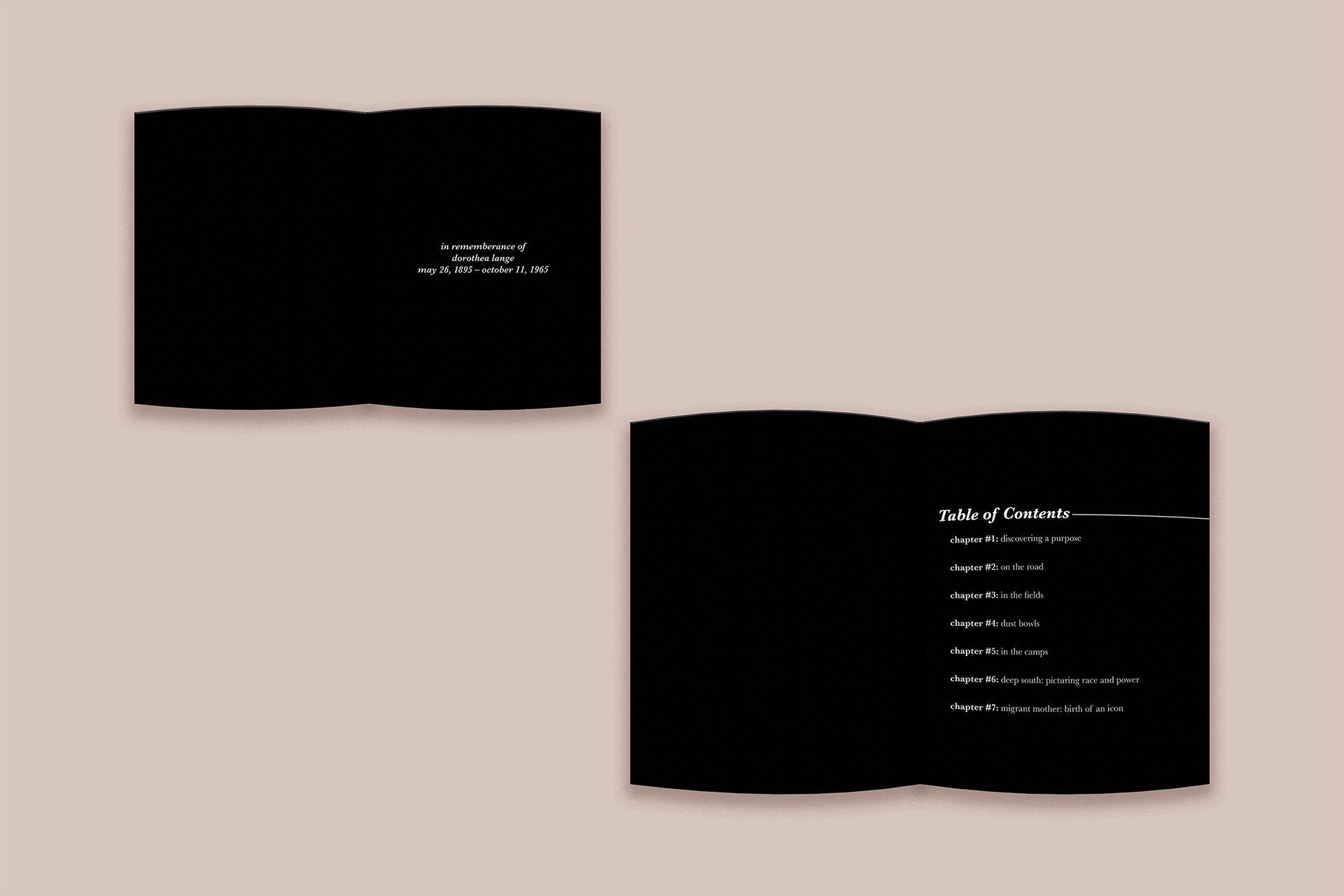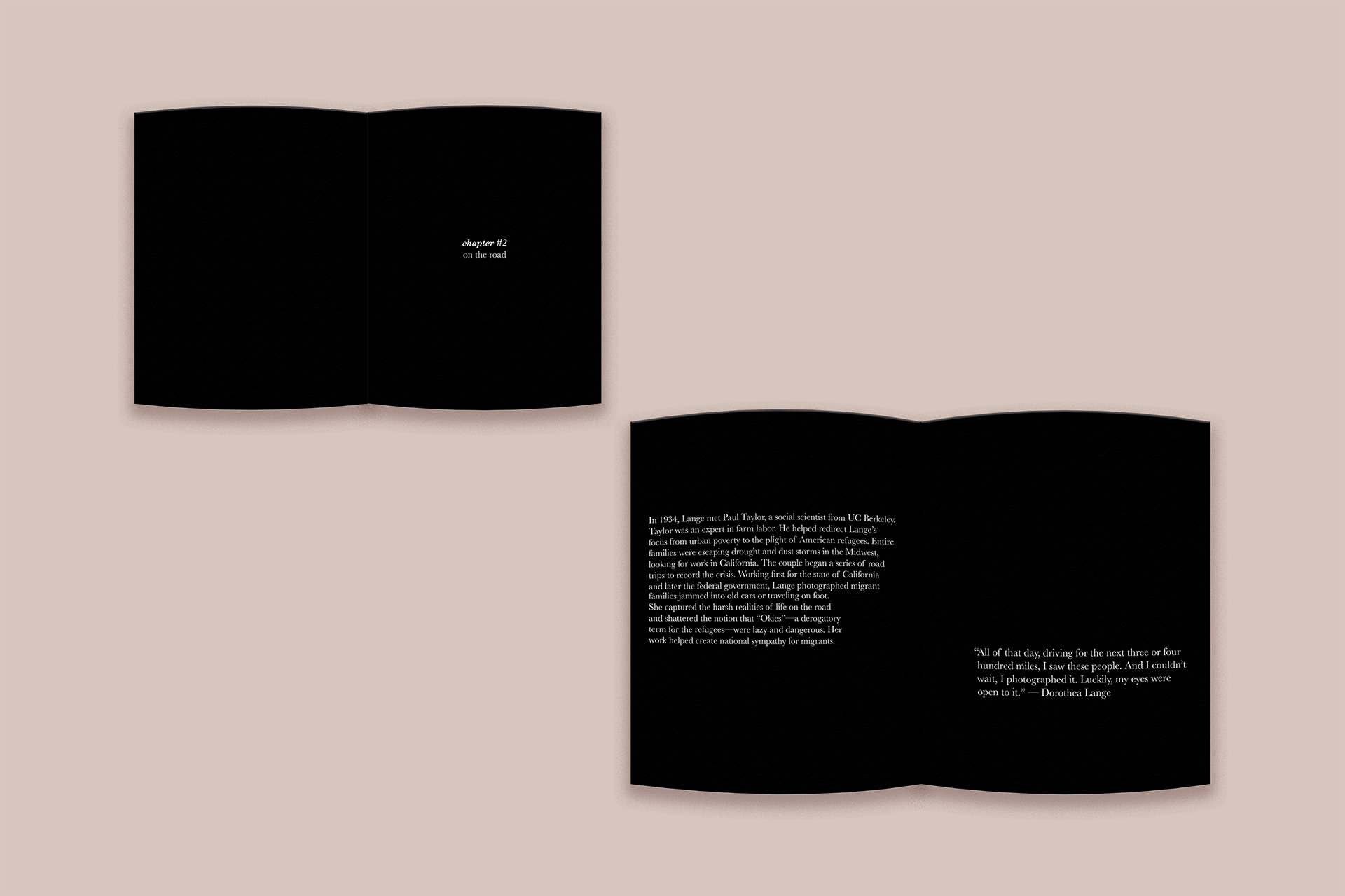 For this project, I designed a sequential book showcasing the work of Dorothea Lange. While researching her photography, I became interested in how each era of her career reflected the changing social and cultural landscape of America. This progression became the main focus of the book’s narrative, guiding the viewer through different moments in her work.