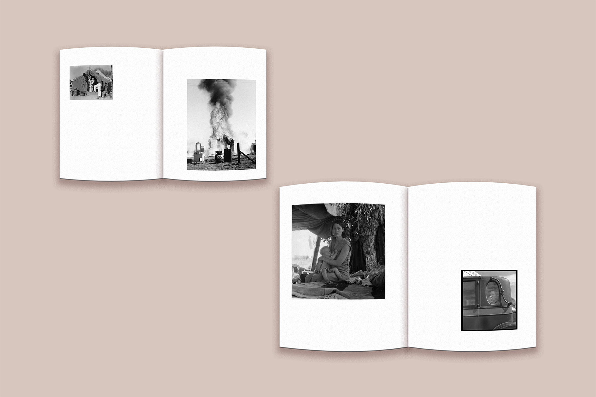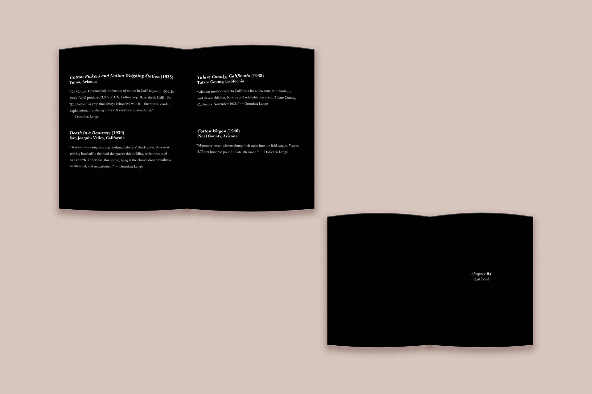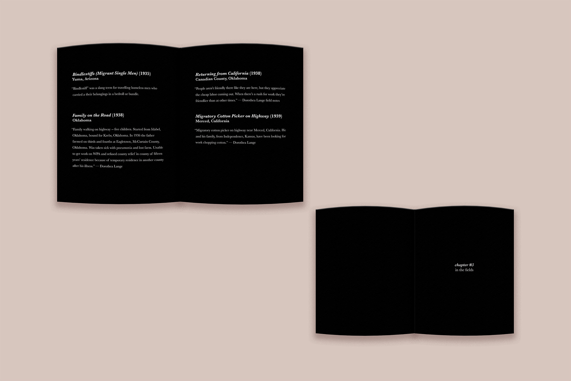 For this project, I designed a sequential book showcasing the work of Dorothea Lange. While researching her photography, I became interested in how each era of her career reflected the changing social and cultural landscape of America. This progression became the main focus of the book’s narrative, guiding the viewer through different moments in her work.